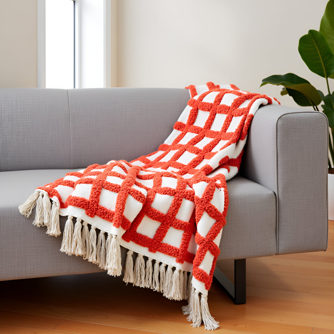 Elegant White & Orange color with handcrafted Tufted throw with tassels; adds a modern yet cozy touch to any space.