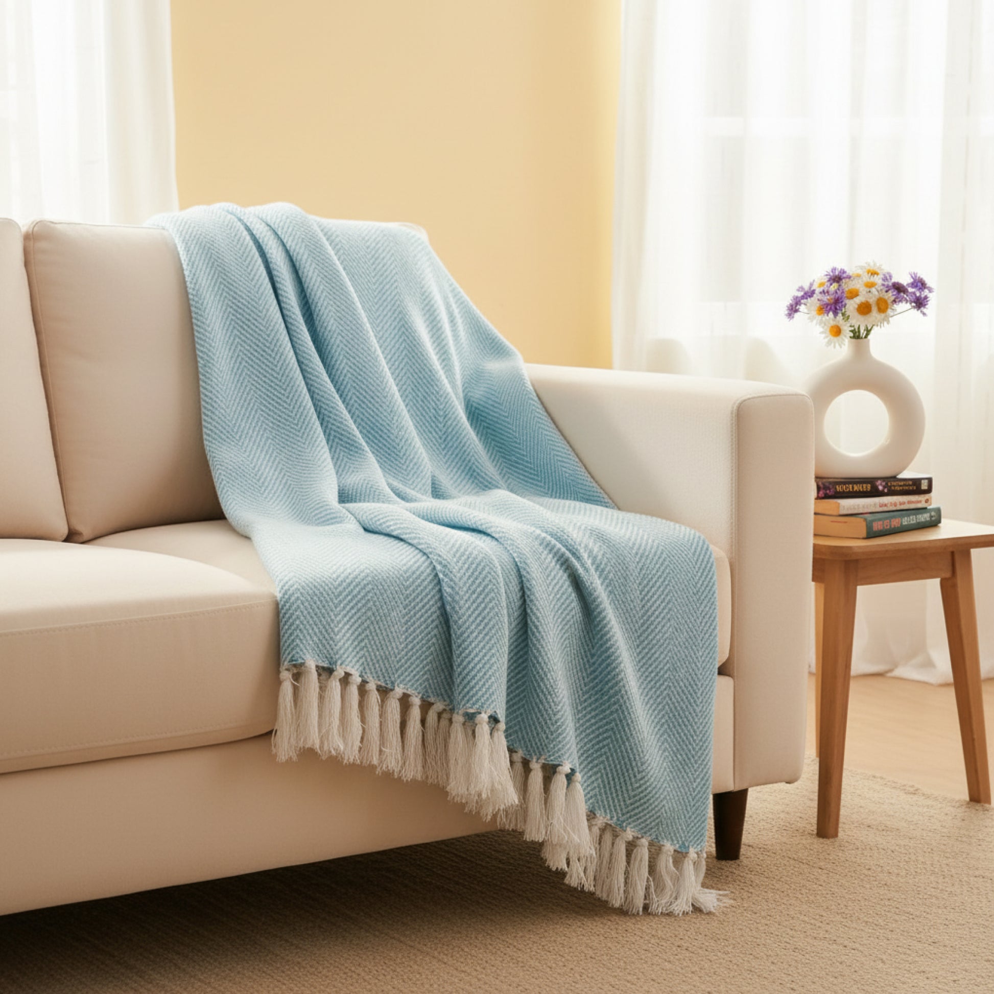 Elegant Sky Blue color with handcrafted tassels & Zig-zag Pattern; adds a modern yet cozy touch to any space.